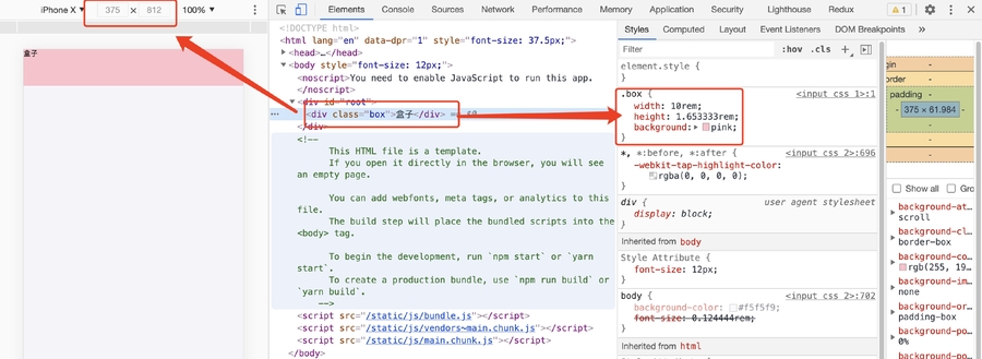 可以看到,iphoneX的尺寸下,html的字体大小为37.5px,此时box的宽度为10rem,再来看看其他尺寸: