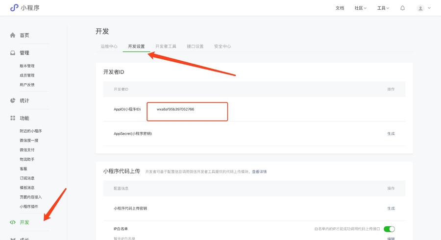 点击确定,就会跳转到小程序后台,这时候,点击左侧“开发”,再点击Tab栏“开发设置”,就可以获取到APPID了: