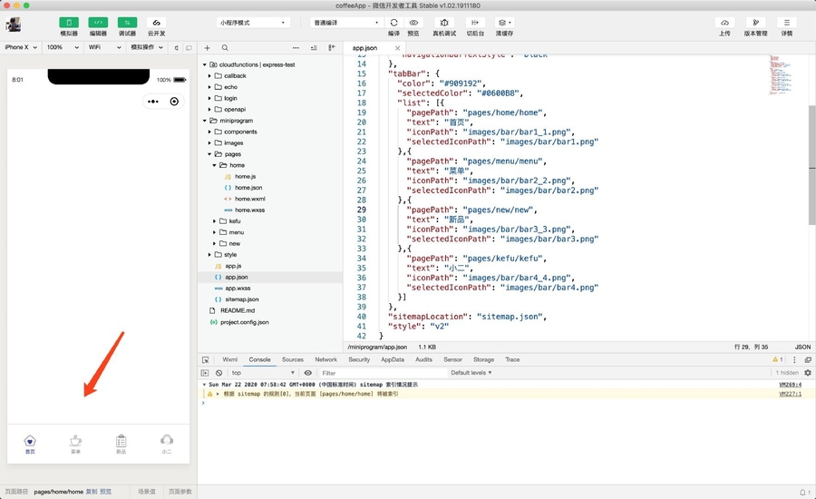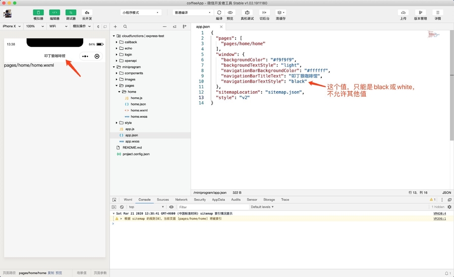 打开 home.json 文件,我们尝试隐藏导航栏:
