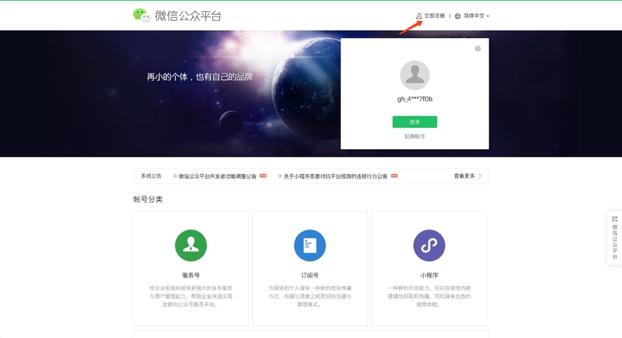 访问 http://mp.weixin.qq.com/ ,并点击 立即注册 :