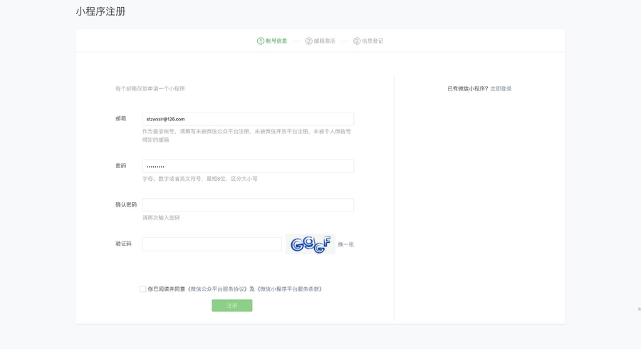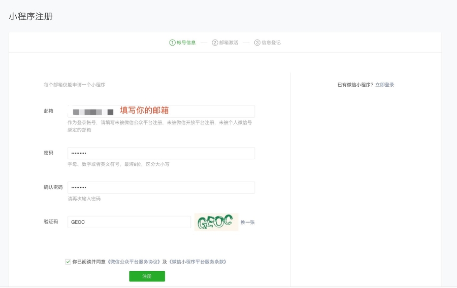 然后填写邮箱和密码(记住:如果你的邮箱注册过微信公众号,请重新注册一个邮箱):