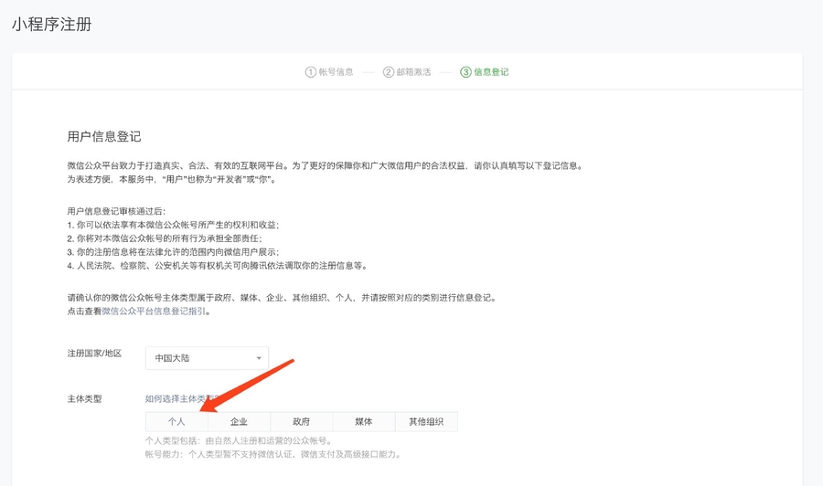 选择“个人”,然后按照要求填写: